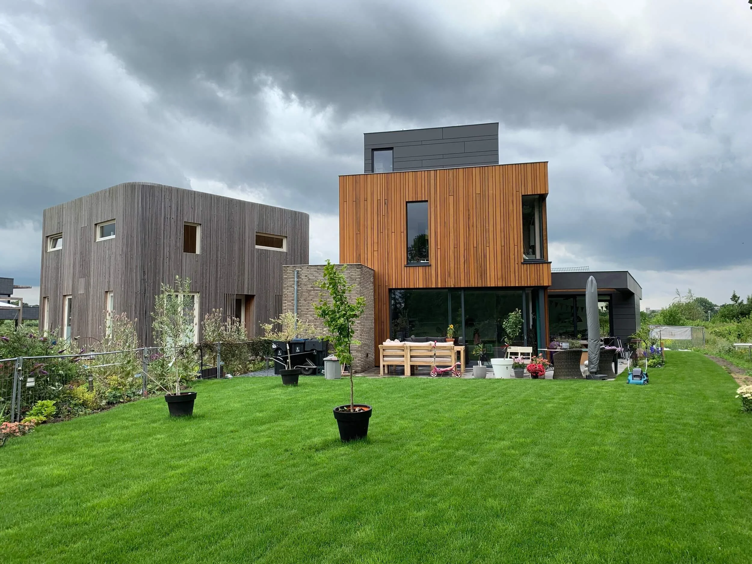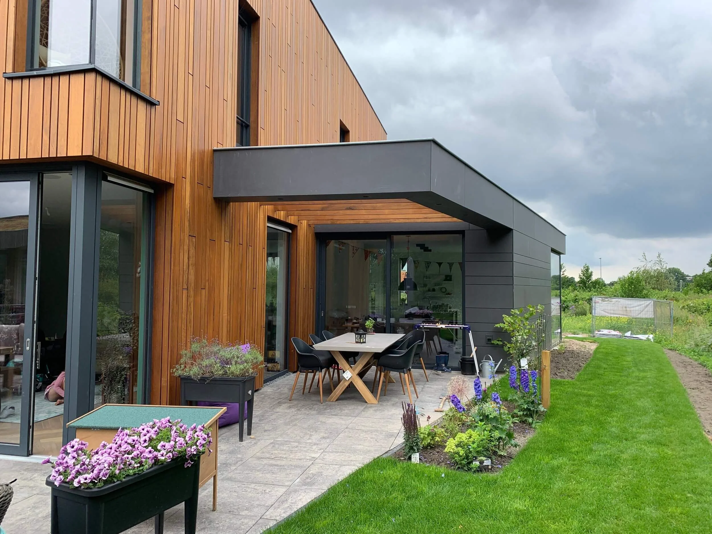 The Family House was conceived as a careful composition of functions, volumes and materials, inspired by Japanese Architecture and Materialisation. The vertical windows are playfully cut out of the equally vertically oriented wood-clad core volume, in various places as full corner cut-outs.